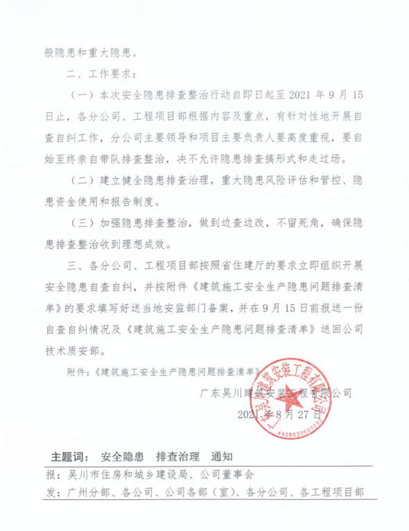 一、根據(jù)省、市住建主管部門關(guān)于全面開展建筑施工安全生產(chǎn)隱患排查治理的通知要求,公司董事會要求各分公司、工程項(xiàng)目部從即日起對在建工地開展建筑施工安全生產(chǎn)隱患排查治理行動。