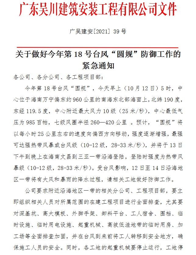 關于做好今年第18號臺風“圓規(guī)”防御工作的緊急通知