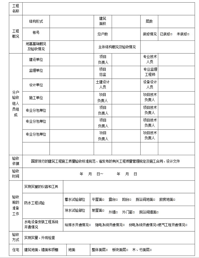 3、“工程概況”欄,涉及工程結(jié)構(gòu)安全的地基基礎(chǔ)和主體結(jié)構(gòu)分部的 驗收是分戶驗收的基礎(chǔ),應(yīng)在表中填寫這2個分部的驗收結(jié)論和驗收時 間; |
